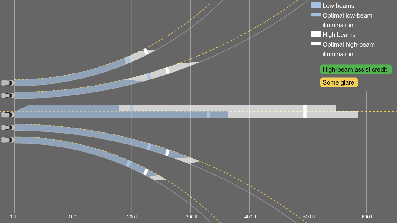 On the base ones, the low beams fall short in the straight-away and the left curves. The high beams also fall short on the left curves. These headlights earn the second highest rating of Acceptable.